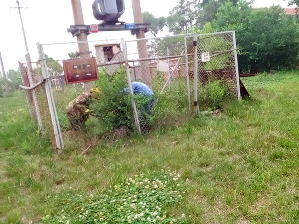 清理外置的變電設(shè)備周圍環(huán)境。通過夏季雨水的滋潤,外置的變電設(shè)備周圍長滿了鹽蒿、蔓草和蘆葦。有的地方雜草叢生人不能進(jìn)入給維護(hù)造成困難,有的地方蔓草越過圍欄直接爬上電桿威脅線路安全,有的直接被淹沒在蘆葦叢中,不見了蹤影,給變電設(shè)備的環(huán)境帶來惡化和安全隱患。為此,供電所組織人員進(jìn)行全面清理,完成了16處外置的變電設(shè)備清理工作。