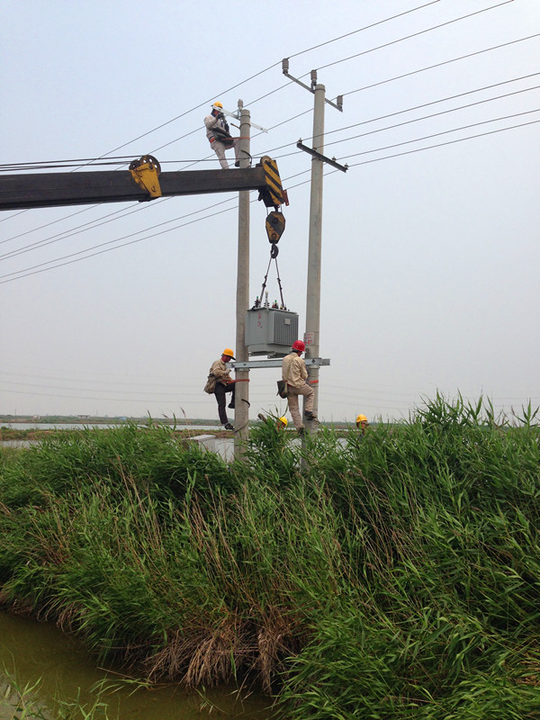 為了保證夏季高溫期,大新水庫2000畝淡水池塘配變盡快安裝到位。6月16日,該支部組織全體黨員開展了黨員奉獻(xiàn)日活動,全體黨員早晨7點鐘上班,工作近9小時,他們不怕天氣炎熱,不怕施工難度大,為職工做出了表率。圖為職工在施工中(宋忠文)