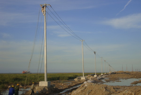 連云新城三期供電線路緊貼海堤邊。受海堤建設(shè)進(jìn)度和海風(fēng)海潮的影響,低矮的壩堤經(jīng)常被風(fēng)刮起的海浪浸頂,石塊突起,洼水漣漪,淤泥纏足,堤邊路面凹凸不平,道路僅限一輛車通行,擁擠不堪,工程施工難度極大。為提升速度,加快進(jìn)度,臺(tái)北供電所克服困難,緊鑼密鼓地展開工作,以期早日完工?,F(xiàn)場(chǎng)勘察地形地貌,了解潮汐運(yùn)動(dòng)規(guī)律,制定施工計(jì)劃,設(shè)計(jì)措施方案,組織人力,采購材料,投入施工。施工人員采用彈性工作時(shí)間,利用落潮時(shí)機(jī),搶運(yùn)電桿,及時(shí)立桿和裝配。職工們發(fā)揚(yáng)不怕苦,不畏難的精神,不懼海風(fēng)吹臉、海水浸衣,爬上距離海平面二十多米仿佛搖擺不定的高桿,懸在空中一絲不茍地操作,保障了工程的全面竣工。