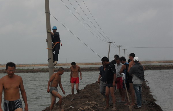 8月2日21時30分,“達維”在鹽城陳家港鎮(zhèn)登陸,帶來狂風暴雨。所轄供電范圍比鄰陳家港鎮(zhèn),臺風造成電力設施損壞,多條10KV線路停電。該所啟動重大氣象災害應急預案,全所職工在崗待命搶修, 8月3日凌晨3時30分有全部到崗工作。4時,職工分頭對線路進行巡視檢查,在第一時間發(fā)現(xiàn)故障點,以便搶修。該所主要領導主動與重要客戶聯(lián)系,及時掌握情況,組織人員搶修。廣大搶修職工不怕困難,不怕疲勞連續(xù)作戰(zhàn),盡快恢復和保證生產(chǎn)生活用電,發(fā)揮了供電人特別能戰(zhàn)斗的精神。由于電桿倒在水中,給立桿帶來了困難,大家主動脫去衣服,跳入到半腰身的水中搶修,有的解線,有的打拉線,個個干得一身汗,一身泥。