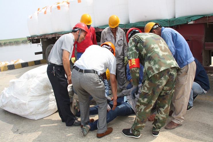 在這次的安全演練中,投資公司運營監(jiān)管部部長李長軍主持了這次的安全演練活動,宵洋物流公司碼頭當班作業(yè)人員參與演練。在五灌河碼頭,正在吊裝的噸袋脫落,砸在一名操作人員的腿上,安全員王緒銀立即指揮停止作業(yè),作業(yè)現(xiàn)場安全負責人陸應(yīng)兵立即現(xiàn)場指揮人員現(xiàn)場施救,查看傷情,撥打120急救電話,同時向單位負責人沈志兵匯報。沈志兵及時趕到現(xiàn)場啟動應(yīng)急預(yù)案,疏散場地車輛,讓出120進場通道,命令救援小組展開緊急救援,并向公司運營監(jiān)管部和領(lǐng)導(dǎo)報告。在救援中,大家各司其職,齊心協(xié)力,配合默契,有條不紊成功完成了此次演練活動。通過這次應(yīng)急演練;進一步提高了公司員工在發(fā)生安全傷害事故時的現(xiàn)場處置能力和自救能力。