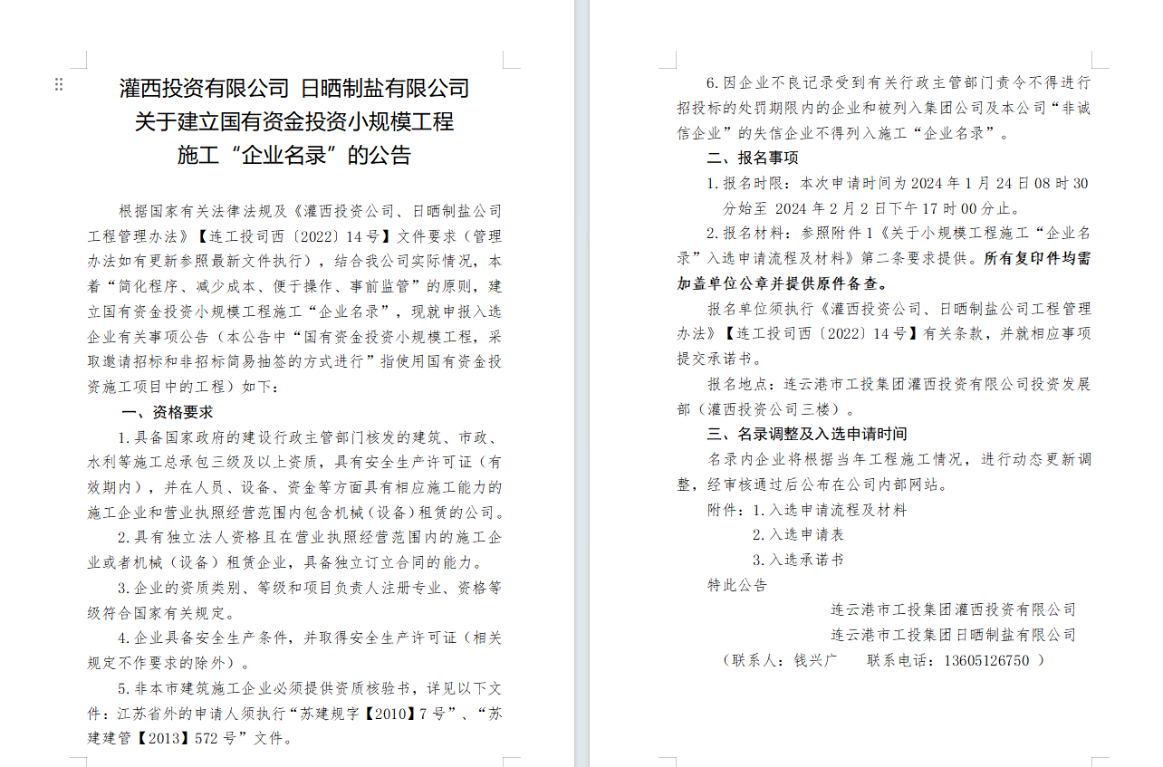 灌西投資有限公司日曬制鹽有限公司關(guān)于建立國有資金投資小規(guī)模工程施工“企業(yè)名錄”的公告