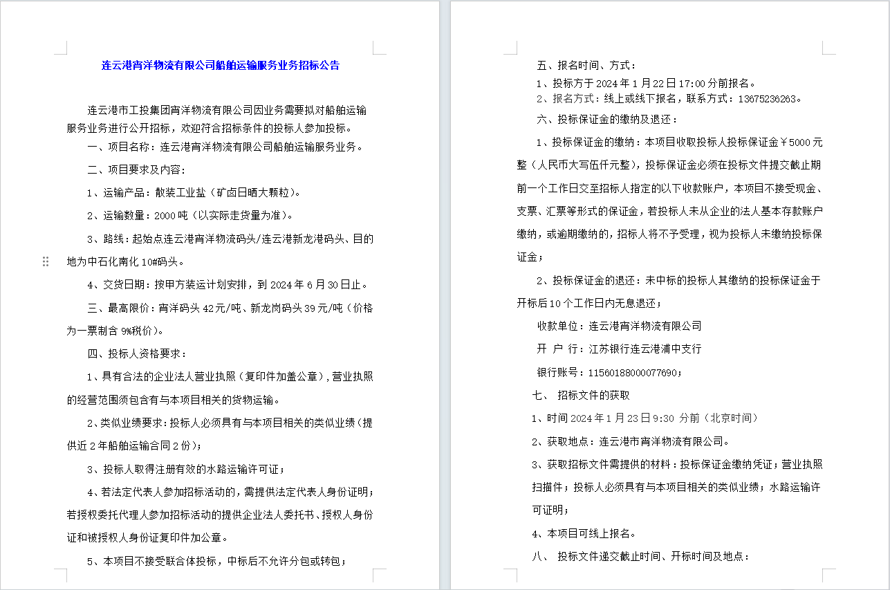 連云港宵洋物流有限公司船舶運(yùn)輸服務(wù)業(yè)務(wù)招標(biāo)公告
