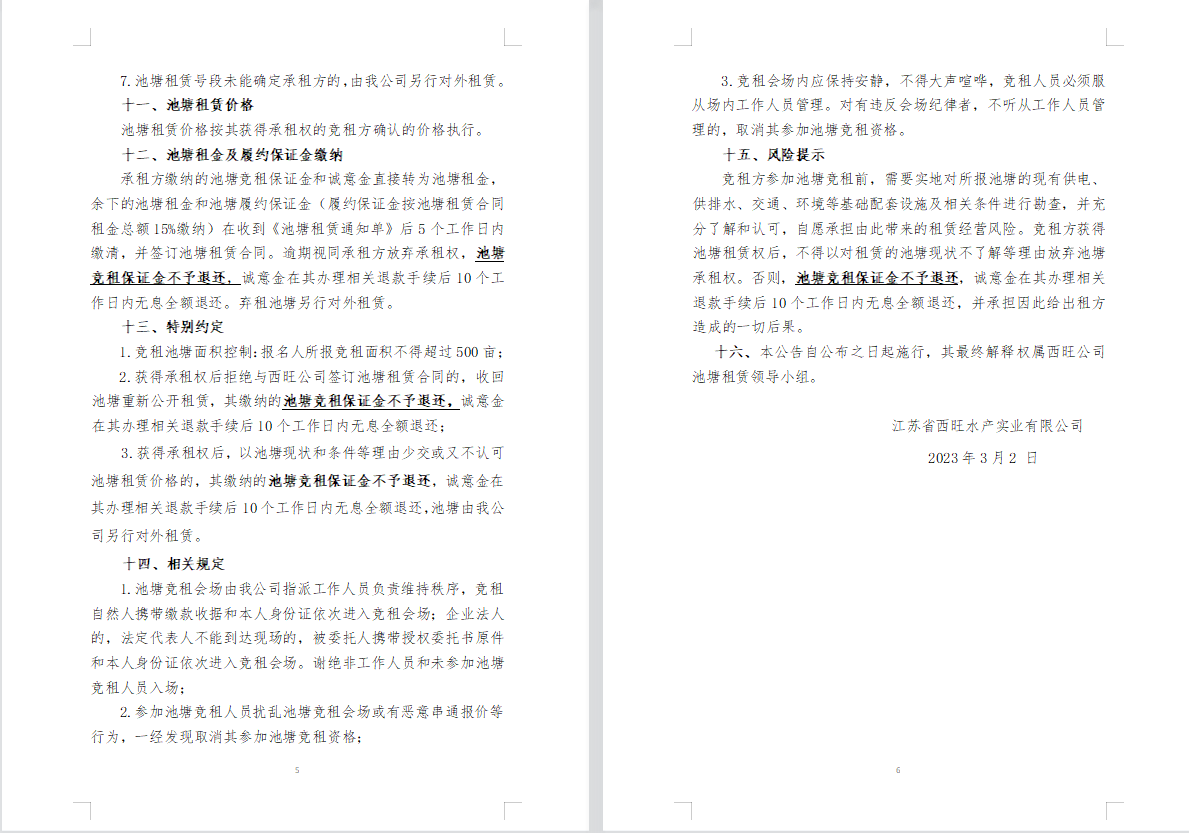 江蘇省西旺水產(chǎn)實業(yè)有限公司2023年度淡水養(yǎng)殖池塘公開競租公告