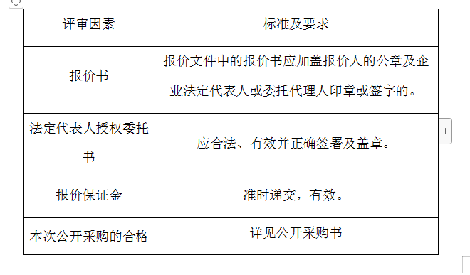 2、評(píng)審委員會(huì)將根據(jù)以下標(biāo)準(zhǔn)對各報(bào)價(jià)人進(jìn)行初步評(píng)審,有一項(xiàng)不符合要求的,作否決報(bào)價(jià)處理,不進(jìn)入詳細(xì)評(píng)審。