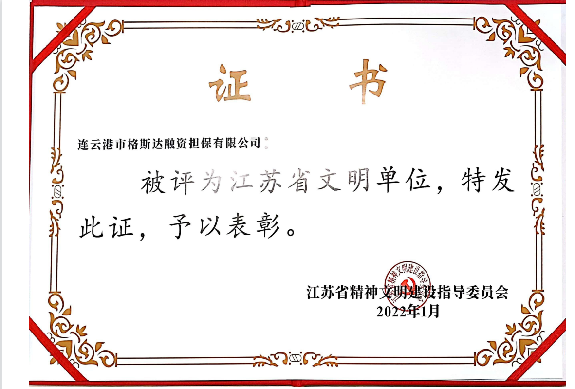1月,格斯達(dá)擔(dān)保公司被省精神文明建設(shè)指導(dǎo)委員會(huì)評為“江蘇省文明單位”稱號(hào)。