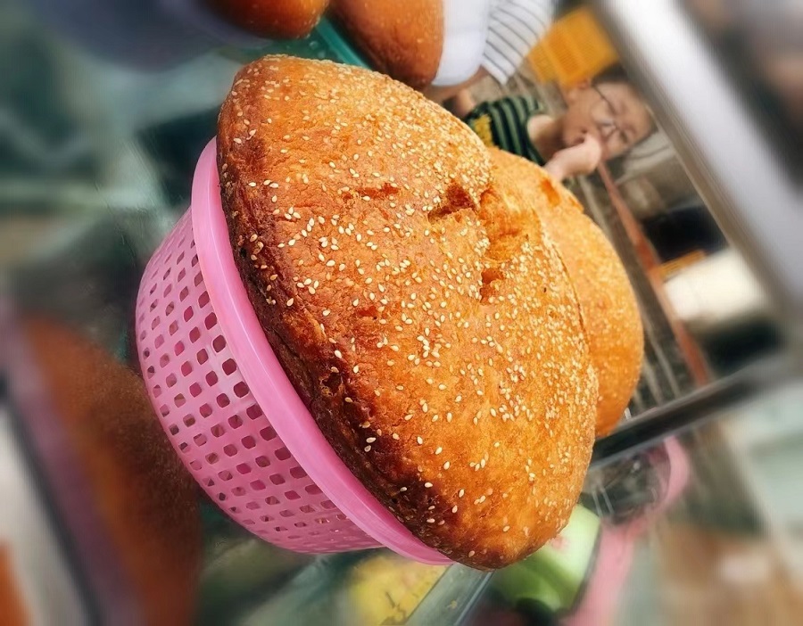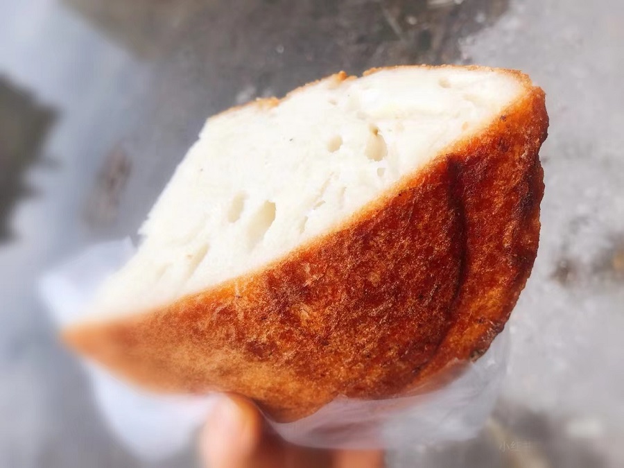 它的做法看似簡單,其實非常考量主婦的功底。面粉加入老酵,放在暖和的地方讓其自然發(fā)酵至漲滿容器。自家的土灶保持最小的火星,鍋內(nèi)刷上薄薄一層油,倒入面糊。面團在鍋中慢慢膨脹,待一年微微發(fā)硬,變焦黃色,撒上一層薄薄的芝麻,刷上一層油,翻面繼續(xù)小火慢焗??此坪唵?,其實沒有幾年做飯功底,還真不一定能成功。一個成功的漲燒餅,外脆里軟,內(nèi)里一個個孔洞,松軟有彈性。我比較喜歡吃外皮,香脆,可口,老年人多愛吃內(nèi)里,有種老酵的清香,微甜。它真的是一款老少皆宜的美味了。