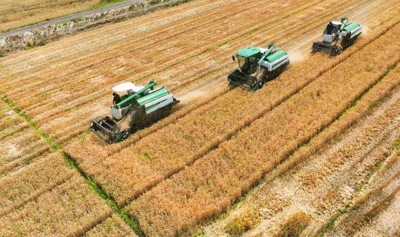 6月8日,在青口投資公司大新農場鹽堿地種植區(qū),小麥一片金黃,麥穗顆粒飽滿,收割機在麥田里來回穿梭加緊搶收小麥。