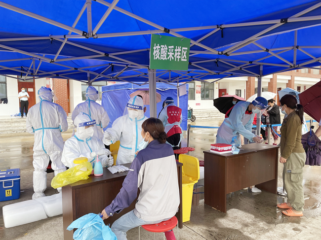 “黨旗飄在一線、堡壘筑在一線、黨員沖在一線”。核酸檢測現(xiàn)場,來自青口公司黨員志愿者在現(xiàn)場為職工群眾提供相關(guān)咨詢和掃碼指導(dǎo)服務(wù),很多黨員在核檢工作中全身濕透仍在雨中盡力維護(hù)秩序,盡管天氣不作美,但是職工群眾依然按工作人員的指導(dǎo)有序地進(jìn)行核酸檢測。大雨里,黨員紅、醫(yī)護(hù)白顯得格外耀眼。(仲偉彬)