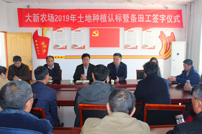 儀式上,宣讀了《青口投資公司 2019年土地種植經營方案》、《2019年條田管理工聘用書》。2名職工簽訂了《大新農場耕地承包合同》,16名職工工簽訂了《條田管理工聘用書》、《大新農場2019年條田工認標書》。