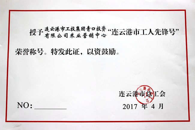 近日,公司米業(yè)營(yíng)銷(xiāo)中心在連云港市總工會(huì)組織的 “2017年度連云港市工人先鋒號(hào)”評(píng)選活動(dòng)中,被授予“工人先鋒號(hào)”榮譽(yù)稱號(hào)。