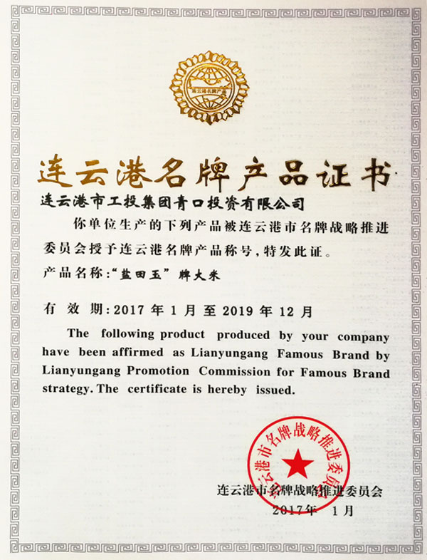 ? ? ? ? 近日,我公司“鹽田玉”品牌大米經(jīng)過連云港市名牌戰(zhàn)略推進委員會審議,被授予2017-2019年度“連云港名牌”稱號。這是米業(yè)營銷中心對“鹽田玉”品牌創(chuàng)建的又一重大突破,也為下一步大米營銷工作打下堅實的品牌基礎(chǔ)。(王踴)