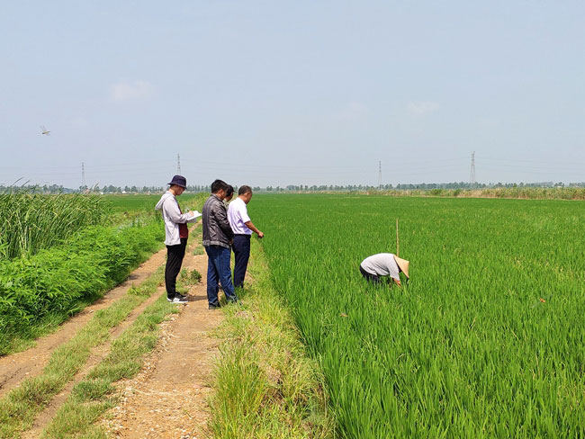 針對近期高溫高濕天氣,為做好水稻生產管理中期生產工作, 7月25日,農場管理人員和農技師頂著烈日深入田間地頭,對水稻基本苗的苗情苗量、病蟲害情況、中期水漿管理逐條田組進行水稻中期生產檢查,對下一步的水漿管理和綜合防治提出指導意見,要求適時擱田,并于7月底至8月上旬進行一次綜合防治。 (陳 ?。?/span>