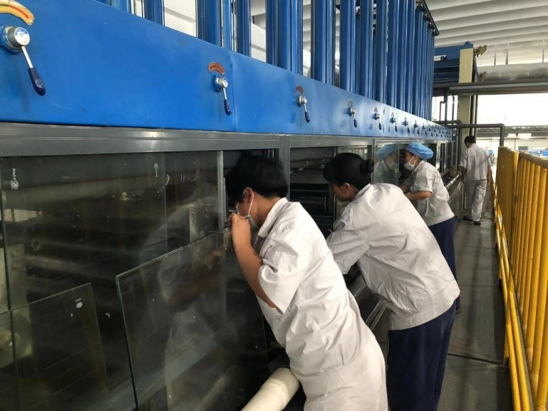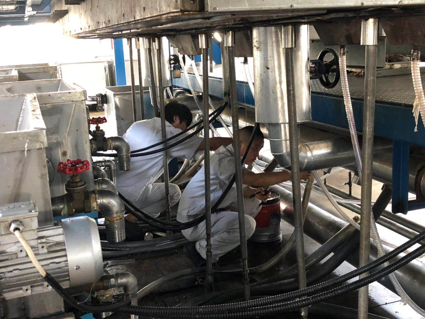 開展生產(chǎn)線設備清理工作。后紡員工無懼炎熱天氣,擼起袖子加油干,面臨萃取機內(nèi)部空間狹小難清理難題時,身材精瘦的員工爭相進入萃取機內(nèi)部進行清理作業(yè),形成“愛企奉獻”工作氛圍。