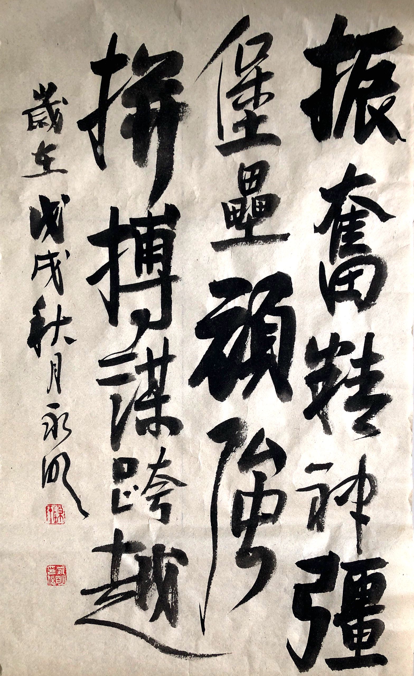 書法作品《振奮精神強(qiáng)堡壘,頑強(qiáng)拼搏謀跨越》