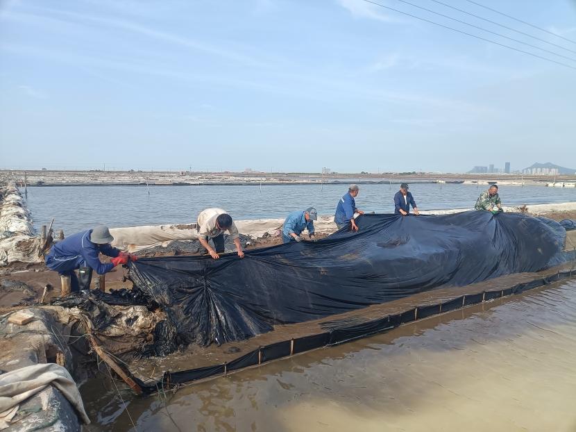 為了盡快完成海濱鈣液儲(chǔ)備池改造,53日,礦鹽班組、鈣液班組人員全員集聚到海濱鈣液灘,把舊塑布進(jìn)行回收安置,同時(shí)對(duì)鈣液輸送管道進(jìn)行細(xì)致的檢查,發(fā)現(xiàn)需要維修的接口及時(shí)維修,確保鈣液儲(chǔ)備池能夠順利完成改造。此次海濱鈣液池的改造可以存儲(chǔ)1.5萬(wàn)方,同時(shí)也可以盡快退出鈣液生產(chǎn)用地,進(jìn)行改造養(yǎng)殖池塘,為公司增加收入。