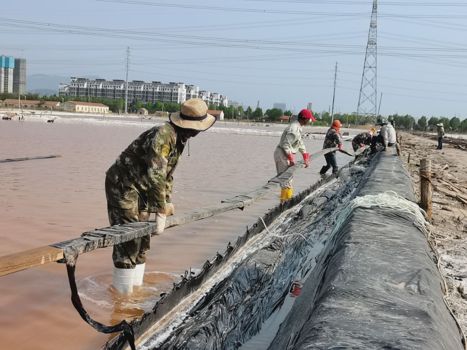 礦鹽生產(chǎn)班組提前謀劃原鹽集運前的準備工作。2022年秋扒鹽已經(jīng)順利落下帷幕,工人們利用收鹽后的空隙對鹽池板進行修整、整理收放系統(tǒng)以及將扒鹽機械進行保養(yǎng)入庫等等。同時,修整運鹽主干道,地基較軟處以鋼板鋪墊,確保運鹽車輛安全通過。排查廩基周圍高低壓線路,在作業(yè)的同時堅守安全生產(chǎn)底線。等待天氣轉(zhuǎn)好,將立即進行原鹽集運。