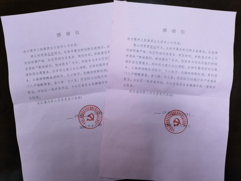 “臺(tái)北投資公司的黨員同志們視疫情防控為己任,服從調(diào)度安排,站好每一班崗,不僅認(rèn)真履行防控職責(zé),又創(chuàng)新開展疫情防控教育宣傳、便民服務(wù)等多項(xiàng)活動(dòng),成為我們社區(qū)防疫攻堅(jiān)的主力軍?!?/span>325日,收到開發(fā)區(qū)猴嘴街道昌圩社區(qū)送來的一份特殊的“禮物”— 一封疫情防控感謝信,感謝臺(tái)北投資公司黨員蘇玲、孫芳等同志在新冠肺炎疫情防控的關(guān)鍵階段挺身而出、伸出援手,參與協(xié)助社區(qū)的疫情防控工作。