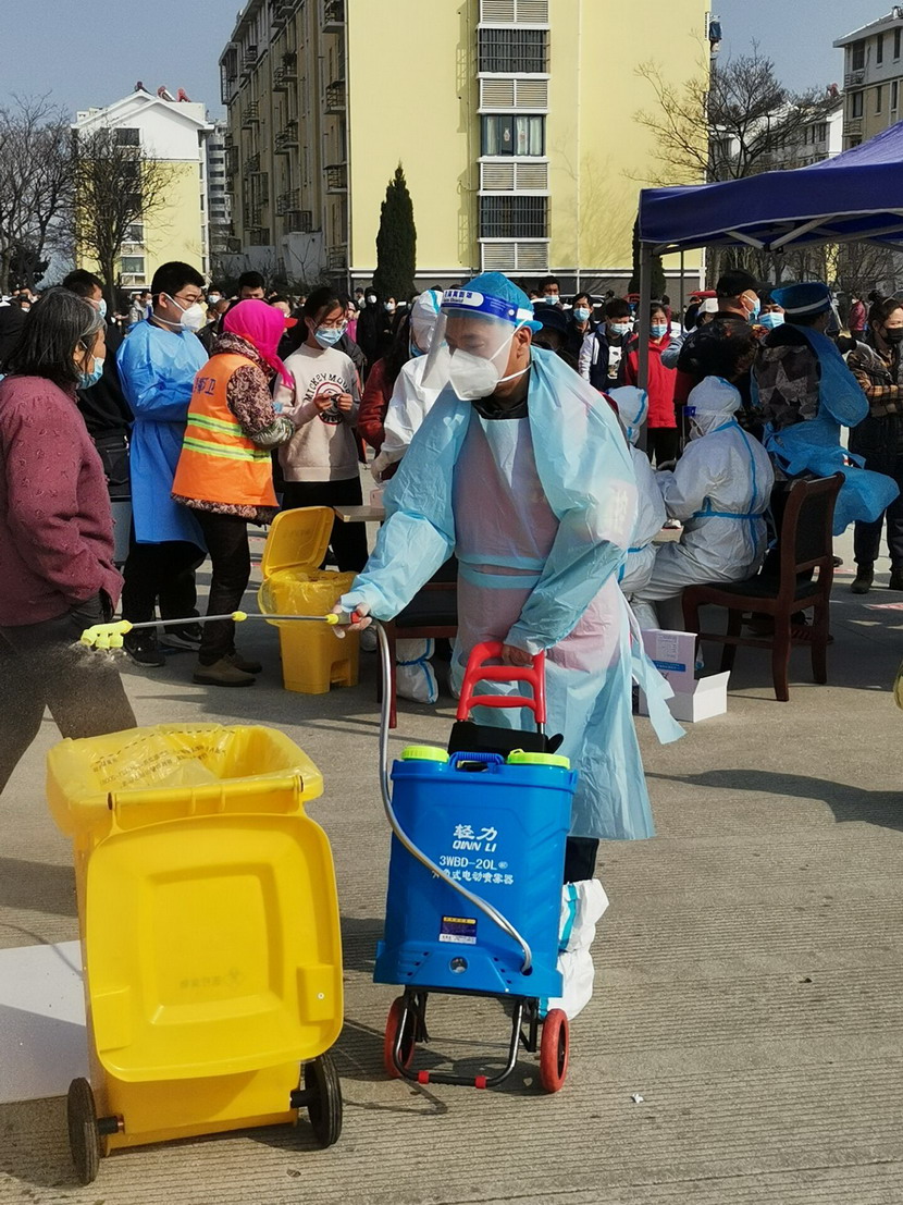 ▲昌圩社區(qū)臨時(shí)黨支部組織委員霍正鋼今天擔(dān)當(dāng)環(huán)境消殺員