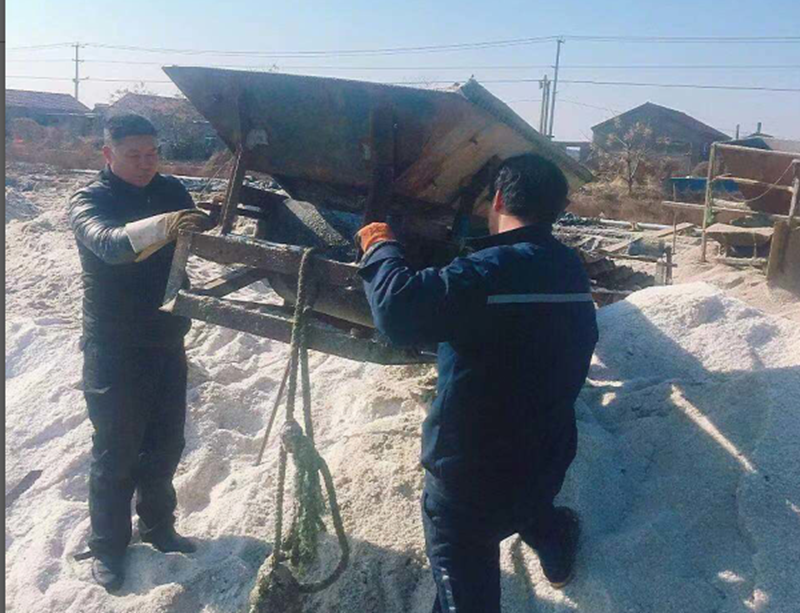 在海洲灣公司的海濱三組原鹽集運現(xiàn)場,過河原鹽皮帶機滾籠上的鋼筋因機械疲勞斷裂造成無法運轉(zhuǎn)。為了不影響原鹽集運,接到通知后,機械班維修人員冒著刺骨嚴寒迅速攜帶電焊機等維修工具趕到現(xiàn)場。露天下,檢查拆卸、焊接加固、安裝調(diào)試一氣呵成,很快機械又重新運轉(zhuǎn)起來。