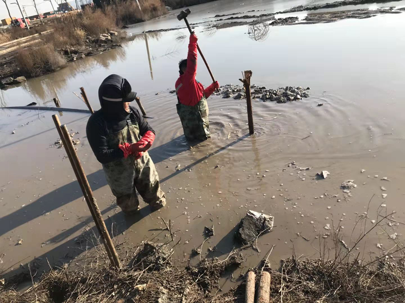 管道巡查發(fā)現(xiàn)通往堿廠的鈣液輸送管道因天氣影響爆裂損壞在送水道泥水中,搶修難度陡然增大。在困難前,我們干事豪情直面挑戰(zhàn)、創(chuàng)業(yè)激情燃燒嚴寒,穿上臃腫的防水皮衩深入到齊腰深的冰水中,卷起袖子雙手在水下摸索著對接管道,擰緊哈弗節(jié)上的每一根螺絲,接下來的打樁捆綁固定一切皆是那么的嫻熟。什么寒風侵肌、冰澈透骨全然阻擋不住我們“鐵軍”干事創(chuàng)業(yè)的激情,鏗鏘有力的大錘不斷打下新一年的希望。