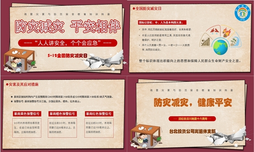 近日,離退休支部開展“5·12防災(zāi)減災(zāi)”科普活動。結(jié)合支部的實(shí)際情況,通過辦公場所用電防火安全檢查和交通出行安全警示,進(jìn)一步排查整改生活、工作中存在的安全隱患。組織觀看防災(zāi)減災(zāi)宣傳片和制作防災(zāi)減災(zāi)PPT來普及防災(zāi)減災(zāi)知識,了解地震、臺風(fēng)、暴雨、洪水等自然災(zāi)害的應(yīng)對措施,來防范化解災(zāi)害風(fēng)險(xiǎn),提升公眾防災(zāi)減災(zāi)的意識和能力,實(shí)現(xiàn)“人人講安全,個(gè)個(gè)會應(yīng)急”。