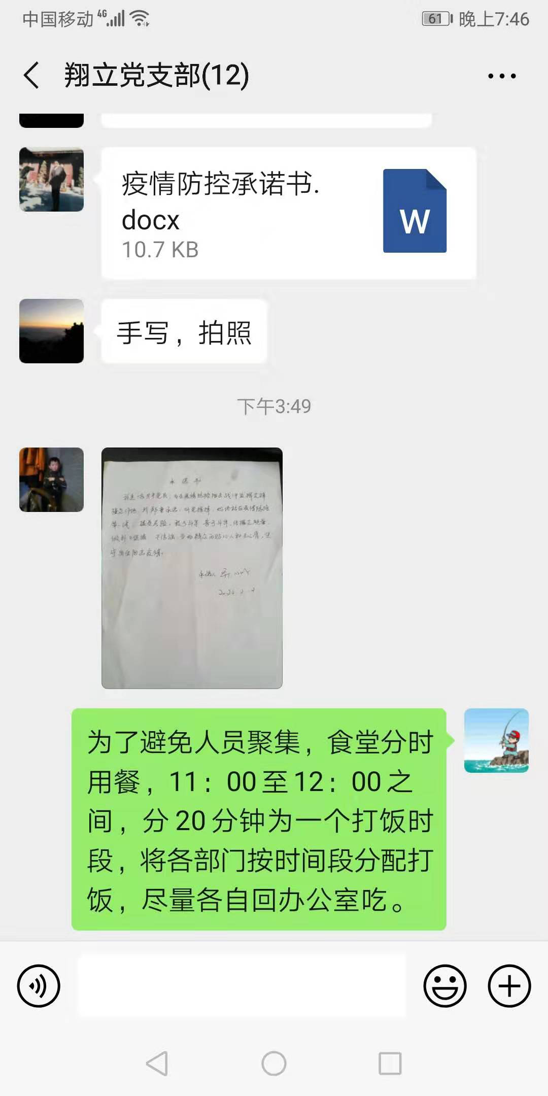 開展疫情防控建言獻(xiàn)策活動(dòng)。根據(jù)公司要求,翔立支部利用支部微信群,QQ辦公群等媒體工具,組織開展了“疫情防控我承諾”,根據(jù)疫情防控要求全體管理人員和黨員同志們簽下承諾書。根據(jù)各崗位特點(diǎn)全員開展“我為疫情防控出份力”活動(dòng),號(hào)召大家出謀劃策,暢所欲言將好的做法,合理的建議等進(jìn)行討論,使大家積極參與到“我為疫情防控獻(xiàn)一策”等活動(dòng)中。