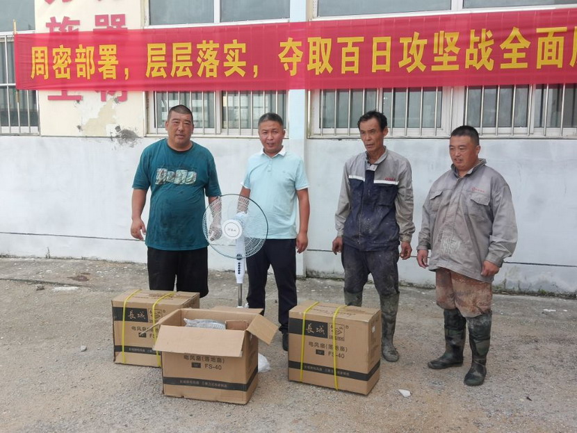 15臺風(fēng)扇陸續(xù)送至“先鋒、昌圩、大浦”三個礦鹽班組,公司領(lǐng)導(dǎo)一邊親手為職工進行安裝,一邊與他們親切交談,詳細了解職工需求,充分肯定他們不畏艱辛、吃苦耐勞的奉獻精神,叮囑他們做好防暑措施,保障身心健康,同時保障生產(chǎn)作業(yè)安全平穩(wěn)。