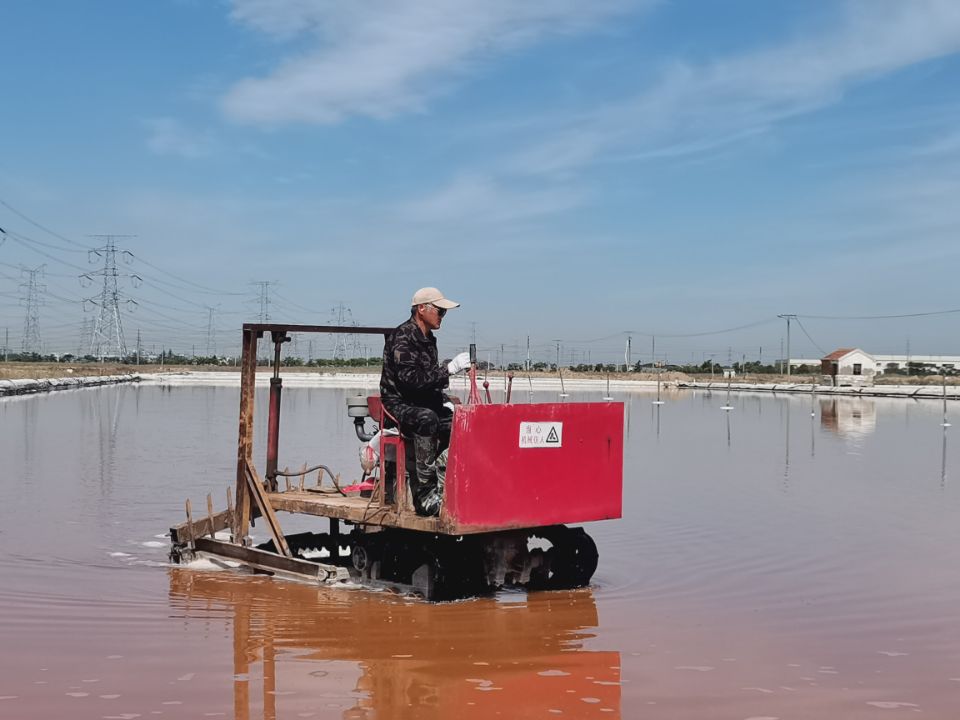 此時(shí)的鹽層大約已有五六厘米厚,若想長(zhǎng)出晶瑩剔透的大顆粒晶體鹽,活碴作業(yè)是必不可少的。每日清晨6點(diǎn),昌圩班組、先鋒班組、大浦班組準(zhǔn)時(shí)有一名工人駕駛活碴機(jī),對(duì)鹽池板進(jìn)行破碎翻動(dòng),保持鹽層的疏松和顆粒間一定的間隙,確保晶體長(zhǎng)得既快又好。通過活碴,鹽顆粒散亂在池底,經(jīng)過陽光照射會(huì)產(chǎn)生不規(guī)則的反射,大大減少了光線反射回水面的概率,易于提高鹵水溫度,增大鹵水蒸發(fā)量,從而增加原鹽的產(chǎn)量。