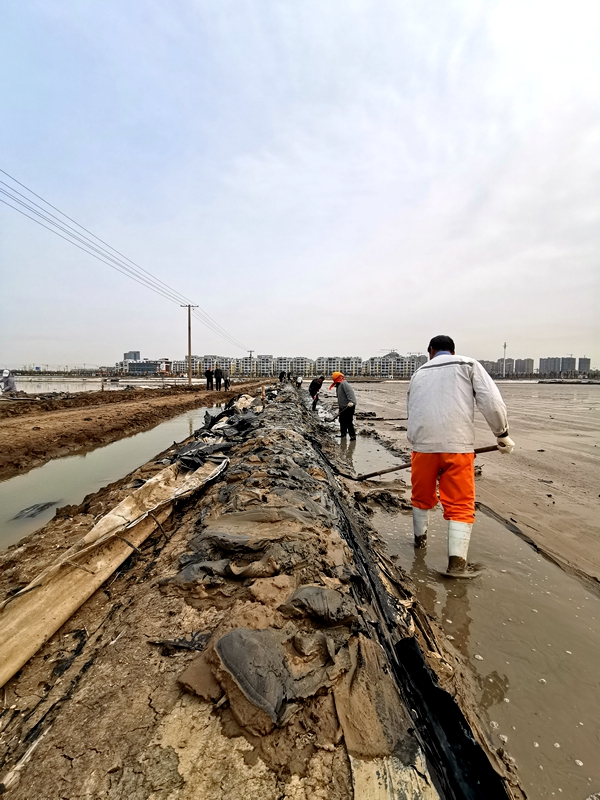 簡單交流后得知,東灘4組要趕在月底之前,將原來用作復(fù)曬的格塊重新改為結(jié)晶池,搶抓旺季增加產(chǎn)量,而東灘人員少,工作量大,僅憑現(xiàn)有的10余名職工,等改造完了灘地,可能就已進(jìn)入了雨季,無奈之下請(qǐng)海州灣公司伸出援手。