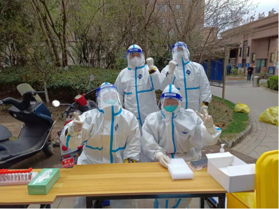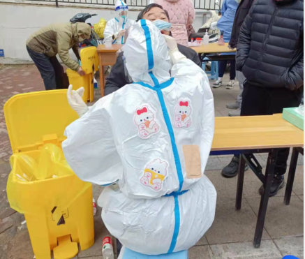 ? ? 12日? 7點集合,領裝備,鑒于昨天的教訓,早上沒喝水,吃了兩口飯,要不大白服就浪費了。出了點意外,排小區(qū)把我們小區(qū)給忘了,沒醫(yī)生來支援,就三個醫(yī)生,三個點,三張臺,隊伍排的那叫一個長?!罢埓蠹野呀】荡a打開,保持一米距離,戴好口罩!”這是我上午說的最多的幾句話。咱們贛榆的醫(yī)生非常辛苦,累了一上午,下午還要采黃碼,掃樓,向他們致敬!中午剛領盒飯就通知徐州支援的醫(yī)生到了,來了十幾個,扒拉兩口飯,開始穿裝備。第七輪結束,感覺人都廢了,渾身濕透,嗓子疼,不想動!