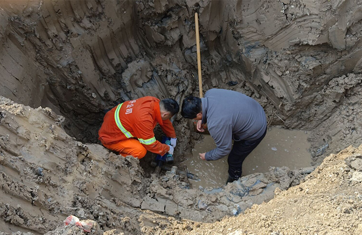 11時,已查明管道漏點處系PE63管道斷裂,至于管道斷裂的原因,判斷是地面沉降使管道落差錯位所致。搶修人員站在2米多深的泥坑里,不怕臟和累,徒手加緊管道搶修。經(jīng)2個多小時緊張有序搶修,成功將斷裂的水管修好。于當日下午1630分恢復(fù)供水,有力保證了轄區(qū)春季綠化澆灌工作正常開展。(王宜全、楊維軍)