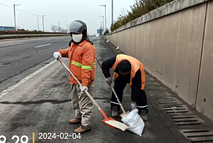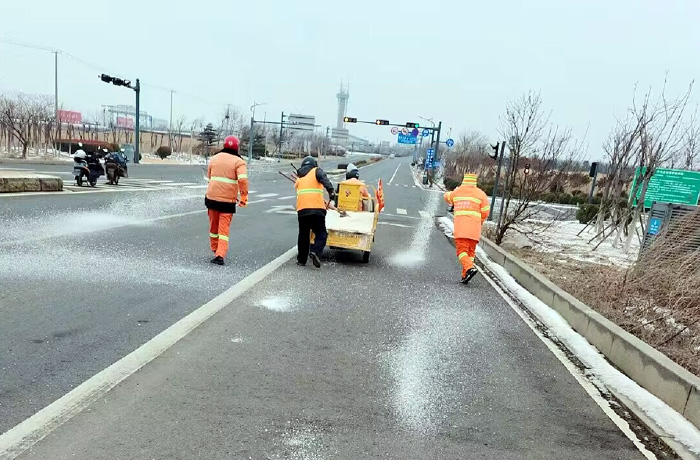 該分公司黨員突擊隊兵分3路,分別來到徐圩大道、港前大道、海濱大道核心路段。生產(chǎn)骨干沈萬軍、李傳武、張樹華等同志他們相互配合,手拿鐵锨簡單有效的進行撒放融雪劑60余噸。發(fā)現(xiàn)道路低洼結冰處及車輛轉彎口,他們立即下車利用雪鏟,有來有回的將冰凍鏟除,消除路面一切安全隱患。