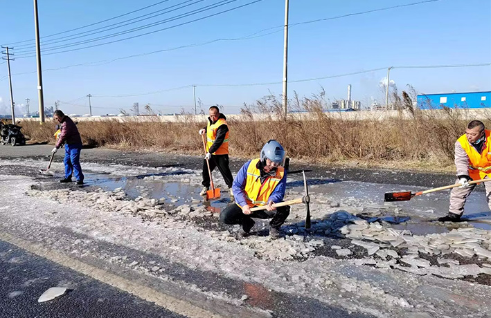 近期由于受冷空氣影響,氣溫低下,園區(qū)道路低洼積水處產(chǎn)生大面積結(jié)冰現(xiàn)象,如不及時清除,嚴重造成車輛側(cè)翻事故發(fā)生。道路排查現(xiàn)場,管理人員及時與園區(qū)二班對接,聯(lián)合開展“破冰保暢通”突擊活動。大家各負其責,齊心協(xié)力,揮動手中鐵銑、羊鎬,經(jīng)過近4個多小時共同奮戰(zhàn),撬動冰塊近400多塊,清理積水300多平方、20多處。