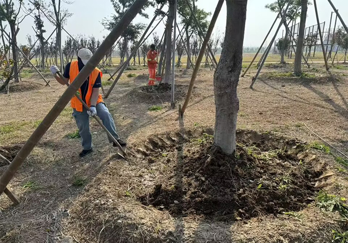 自十月中下旬以來,班組全體成員積極準備,做好抗旱保障工作。每天早晨7點,兵分二路,按照各自分工迅速行動起來。葛承東帶領一部分工人對櫻花林、紅梅林整理樹圍;田恒亮帶領一部分工人施肥澆水,有的同志拎小提桶施肥,有的拿自來水管在后面澆水。為保證水流進樹木根系,工作人員采取多種方法讓葉片、根系喝足水。為堅決打贏這場抗旱保樹木攻堅戰(zhàn),綠化分公司在堅持科學用水、節(jié)約用水的前提下,通過科學的修剪植物、抹芽,松土,除草等措施確保苗木安全度過干旱天氣。由于抗旱工作啟動較早,措施得當,抗旱保苗工作已取得初步成效。目前為止,已經(jīng)完成7000余棵櫻花林和紅梅林的施肥、澆水工作。