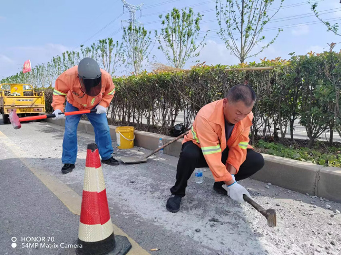 228省道西側(cè),班長姚功巡查時(shí)發(fā)現(xiàn),有近50多米長混凝土攪伴物拋灑主干道路面,如不及時(shí)處理,嚴(yán)重影響路面行車安全。班長姚功及時(shí)召集隊(duì)員,馬不停蹄趕赴道路現(xiàn)場。上午10時(shí)左右,室外氣溫已經(jīng)直逼35℃,大家顧不上天氣的炎熱,揮動(dòng)手中鐵錘,不停地震動(dòng)路面“凍結(jié)”已久的水泥,黨員胡可貴與同事徐育軍、伏彩林主動(dòng)參戰(zhàn),交替使用手中的撬棍,盡管汗水浸透橙色衣衫,雙手磨出了血泡,大家也沒有叫苦叫累,經(jīng)過近三個(gè)多小的努力奮戰(zhàn),終于恢復(fù)原有黑色柏油路面。